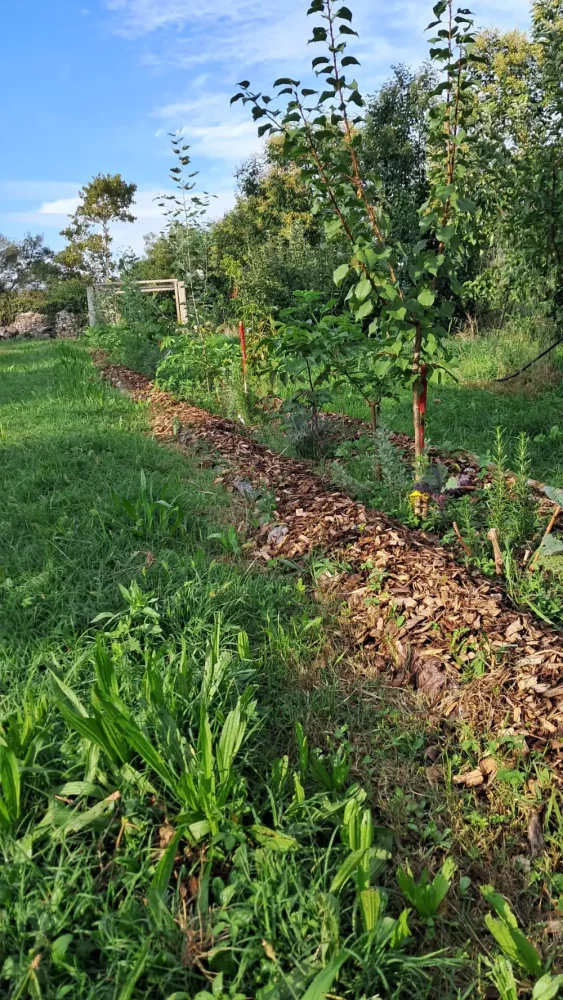 Ramaglie, foglie e altri rifiuti vegetali vengono accumulati e compostati. A partire dal 2021 sono state introdotte delle siepi morte lungo il muro della proprietà, evitando l’asporto e garantendo un habitat a piccoli animali ed insetti. Si sta di nuovo ragionando in termini di sfalcio e di zone dove il prato viene lasciato crescere, cosa che ci fa risparmiare sui costi del trattore ma che riduce anche l’evaporazione. Da poco si è anche riusciti a portare gli asini a pascolare, con la consapevolezza che questo aiuta la rigenerazione del suolo.
